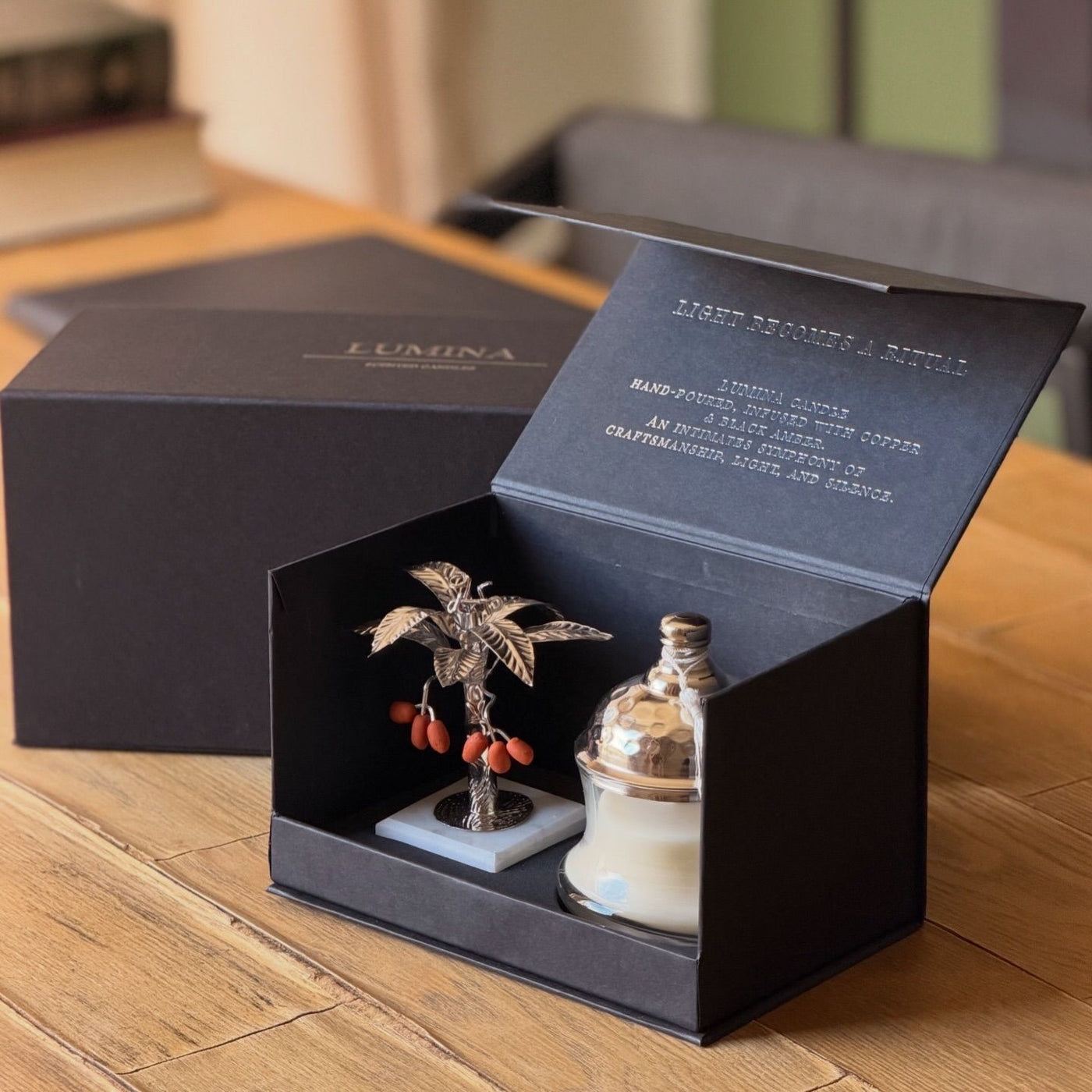 coffret "lueur berbère"  : éveillez vos sens avec ce coffret artisanal. il contient un bougie aux senteurs raffinées, présentée dans un contenant en cuivre martelé, et un délicat petit olivier en ambre et cuivre. un rituel de lumière et d'artisanat.