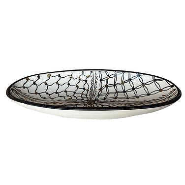 Ce plat de service ovale en céramique fait main est un accessoire de table élégant et fonctionnel. Il se distingue par son motif bicolore unique, peint à la main en noir et or, qui sépare le plat en deux sections.
