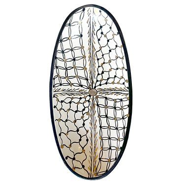 Chaque côté présente un motif géométrique différent : un treillis délicat d'un côté, et un motif de rosaces de l'autre, créant une belle harmonie visuelle. Les points dorés apportent une touche de luxe et de brillance.