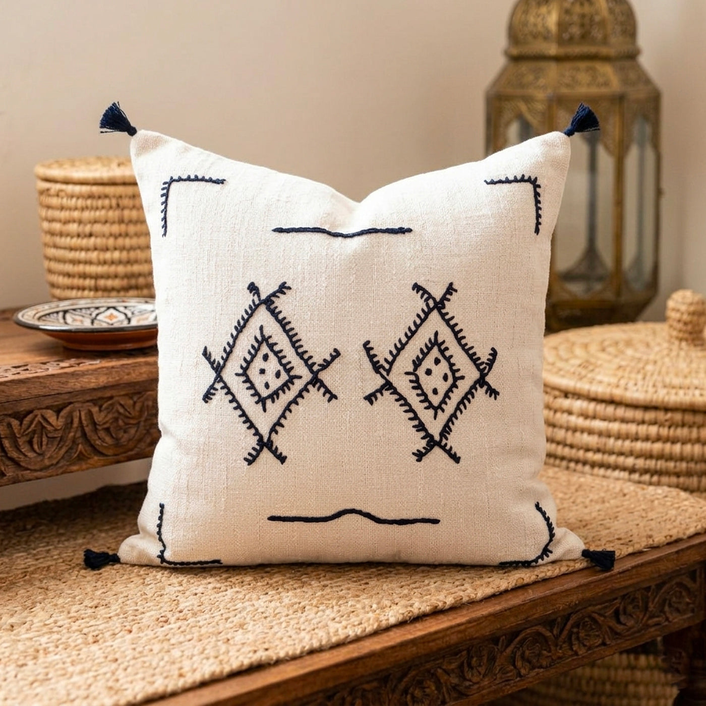 Ce coussin berbère, tissé et brodé à la main en Tunisie, est un véritable chef-d'œuvre d'artisanat. Les motifs géométriques, inspirés des tapis kilim, sont réalisés en laine mérinos douce et chaude. Les couleurs naturelles (ocre, terracotta, blanc) créent une ambiance chaleureuse et invitante.